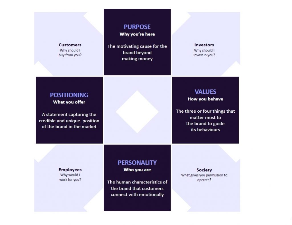 This is perhaps one of the most important elements in this process. Getting your brand positioning wrong may invalidate all the hard work you’ve done. When considering the brand positioning, you have to define the purpose of the brand, the unique territory that the brand will occupy, the functional and emotional benefit of the brand for the target audience and the brand values. These are the critical pillars that will form your brand strategy as the diagram below indicates.