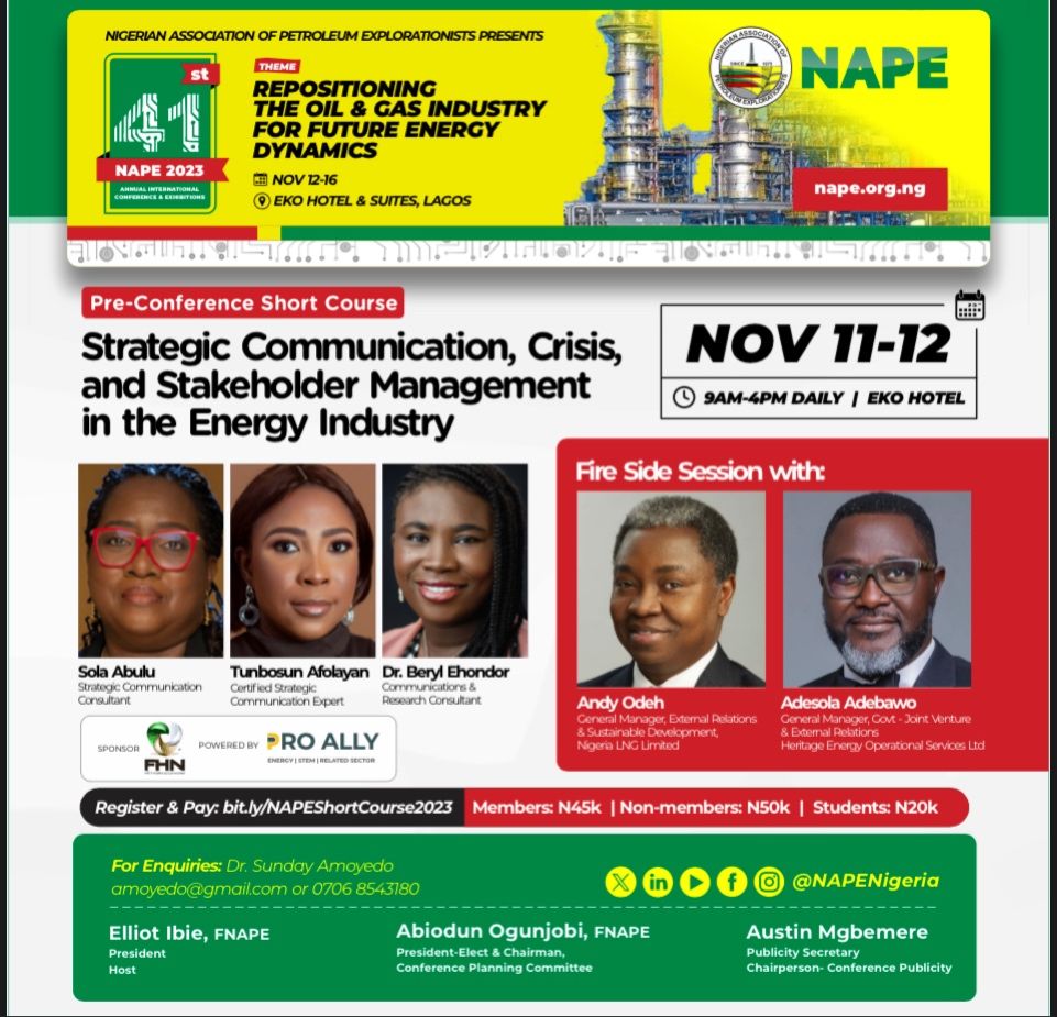 When I saw the post about the NAPE Short Course on Strategic Communications, Crisis and Stakeholder Management in the Energy Industry in Nigeria, I just knew I had to be there. Put together by Pro Ally, this course was part of the pre-conference activities for the 41st Annual Conference of the Nigerian Association of Petroleum Explorationists (NAPE).